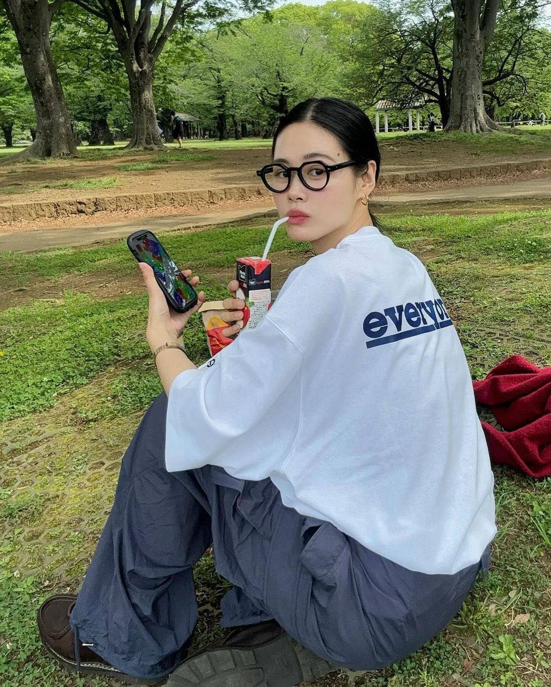 圆圆的粗框眼镜堪称她的标志性造型,还有那毫无偶像包袱的灿烂笑容,有时笑起来脸会揪在一起,但正是这种零偶像包袱,给人一种自在放松的气息,仿佛隔着荧幕都能被她所感染的快乐氛围。